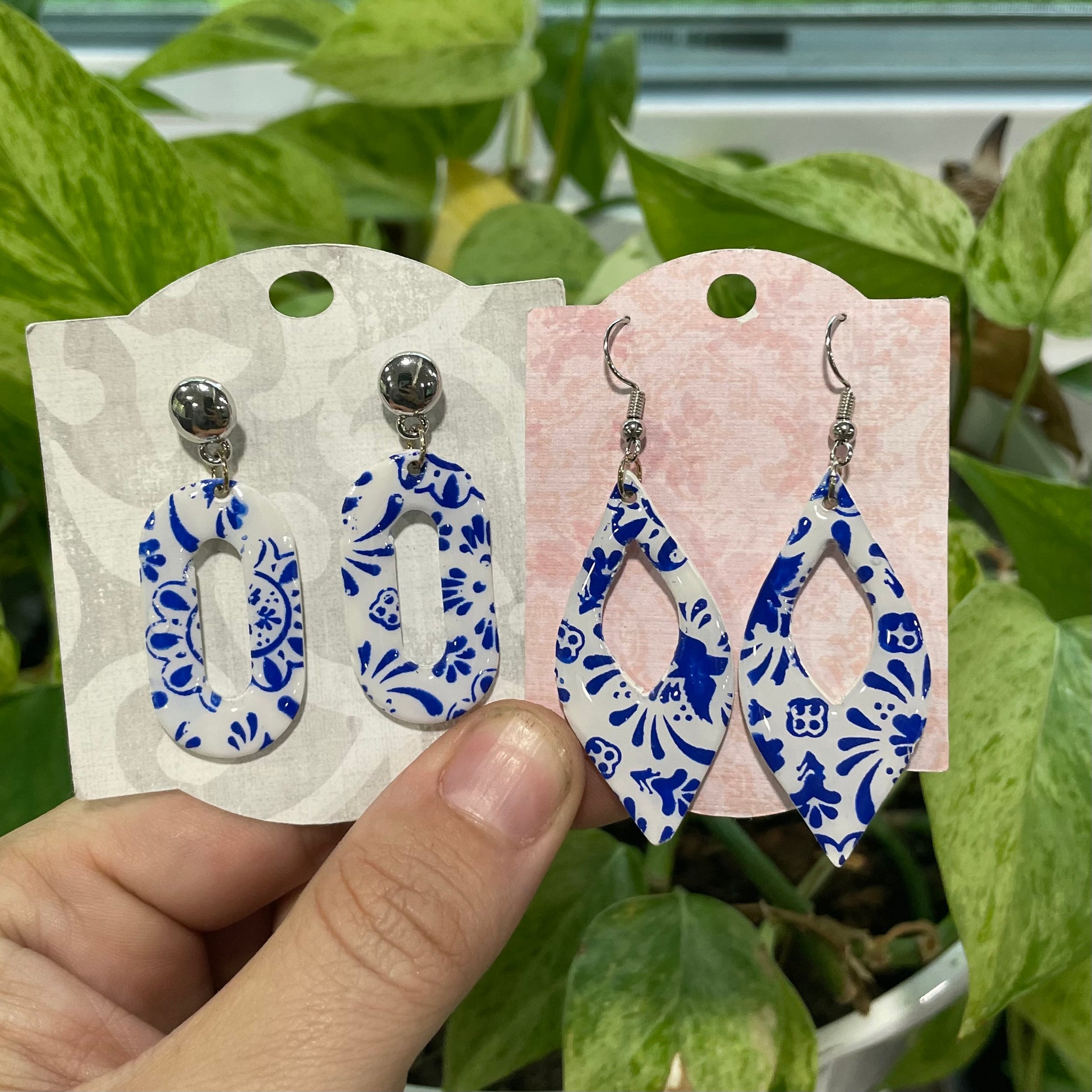 Inspired by the timeless elegance of traditional Chinese porcelain, the Blue China earrings feature delicate hand-crafted clay in shades of soft blue and white. Each pair is uniquely designed to evoke a sense of serene beauty and intricate craftsmanship. Perfect for adding a touch of artistic flair to any outfit, these earrings offer a chic blend of modern style and classic charm.