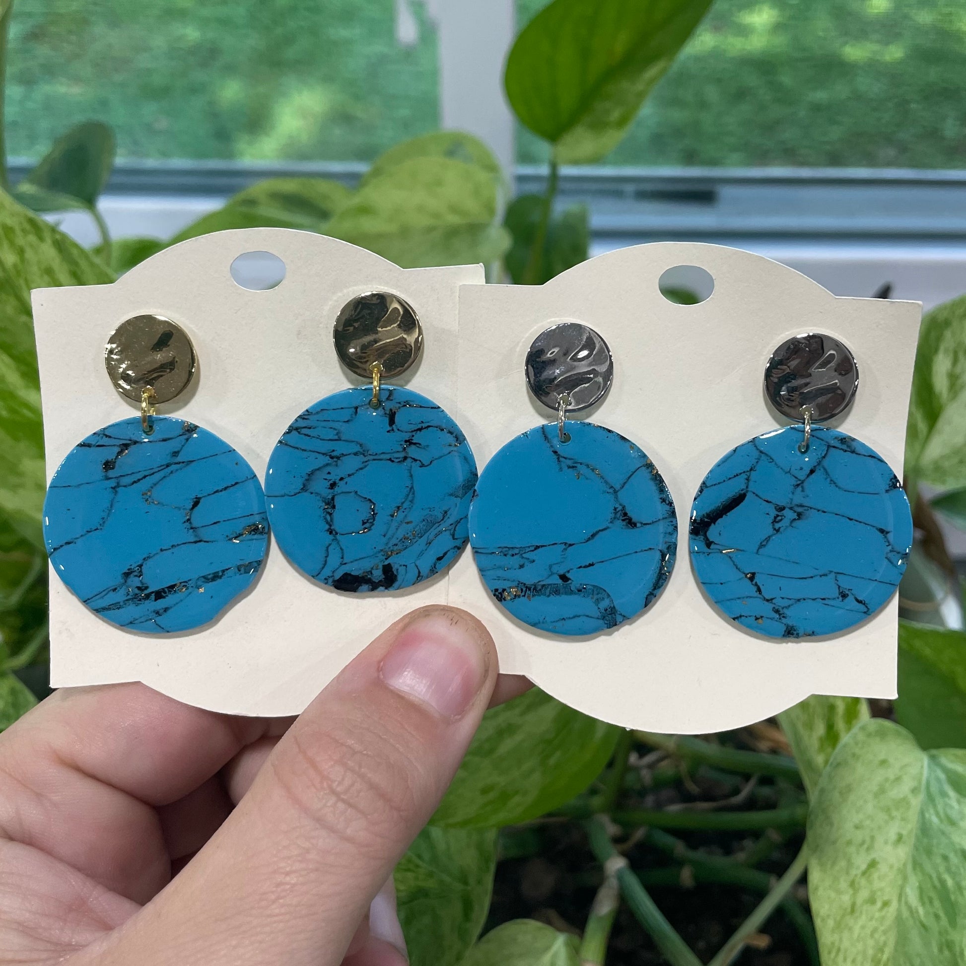 These handcrafted blue turquoise earrings are made from lightweight clay, offering a vibrant pop of color and a unique, artisanal feel. Their delicate, yet durable design adds a touch of boho-chic charm to any outfit, making them perfect for both casual and dressed-up occasions.