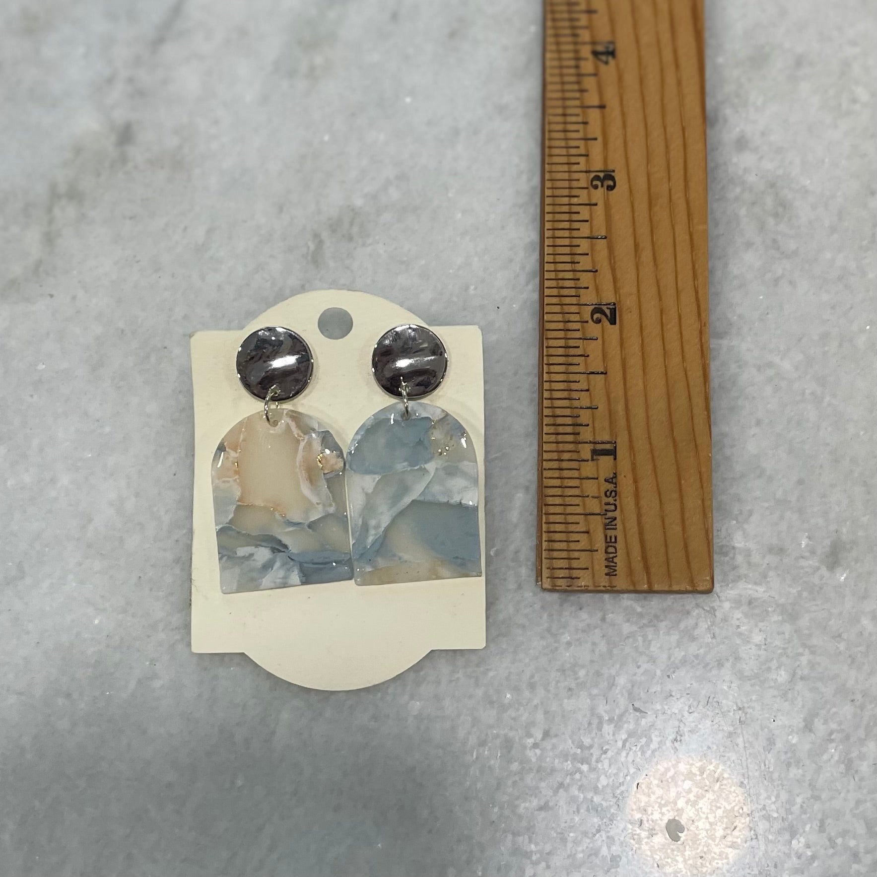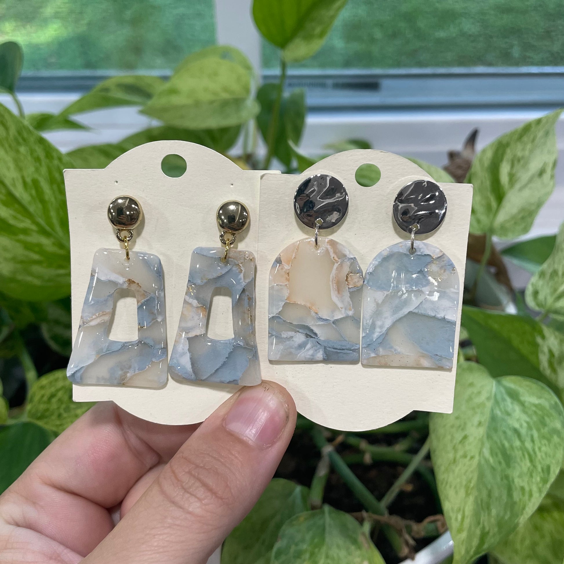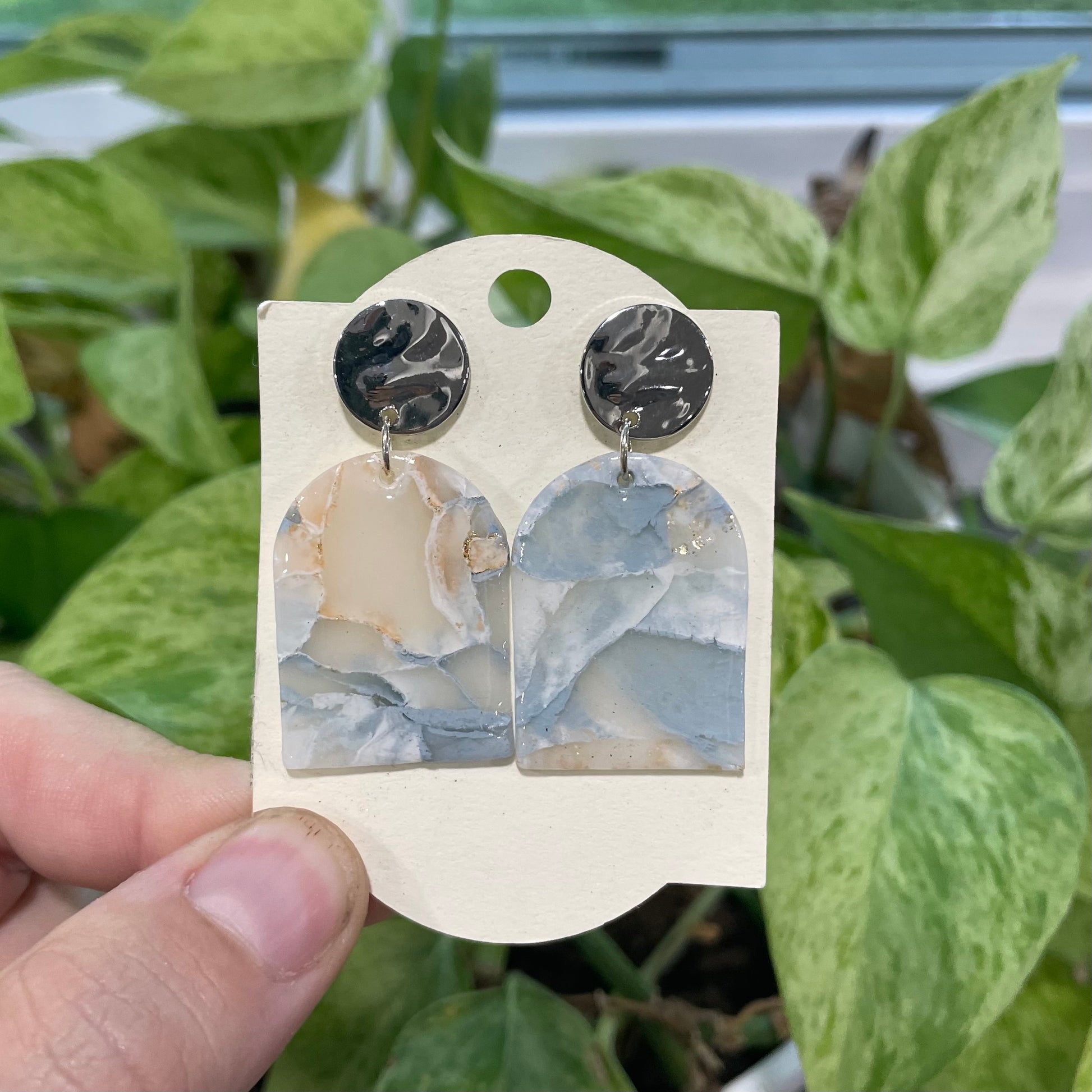 These elegant earrings feature a stunning blue and white marble design, handcrafted from lightweight clay for all-day comfort. With their modern swirl pattern and timeless color palette, they add a stylish and sophisticated touch to any look.