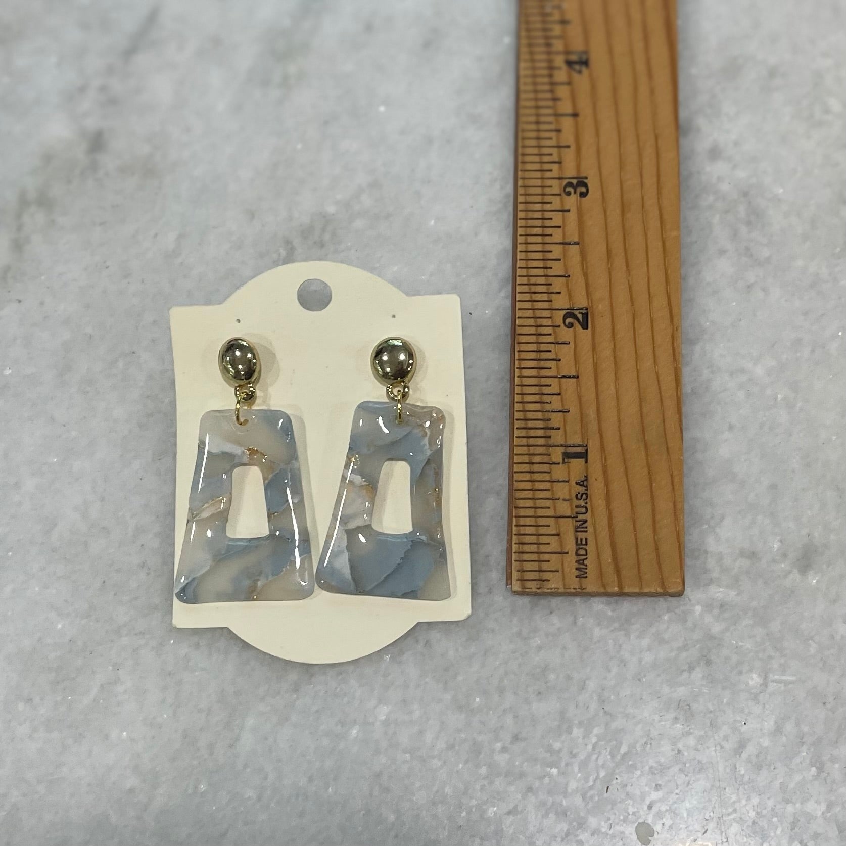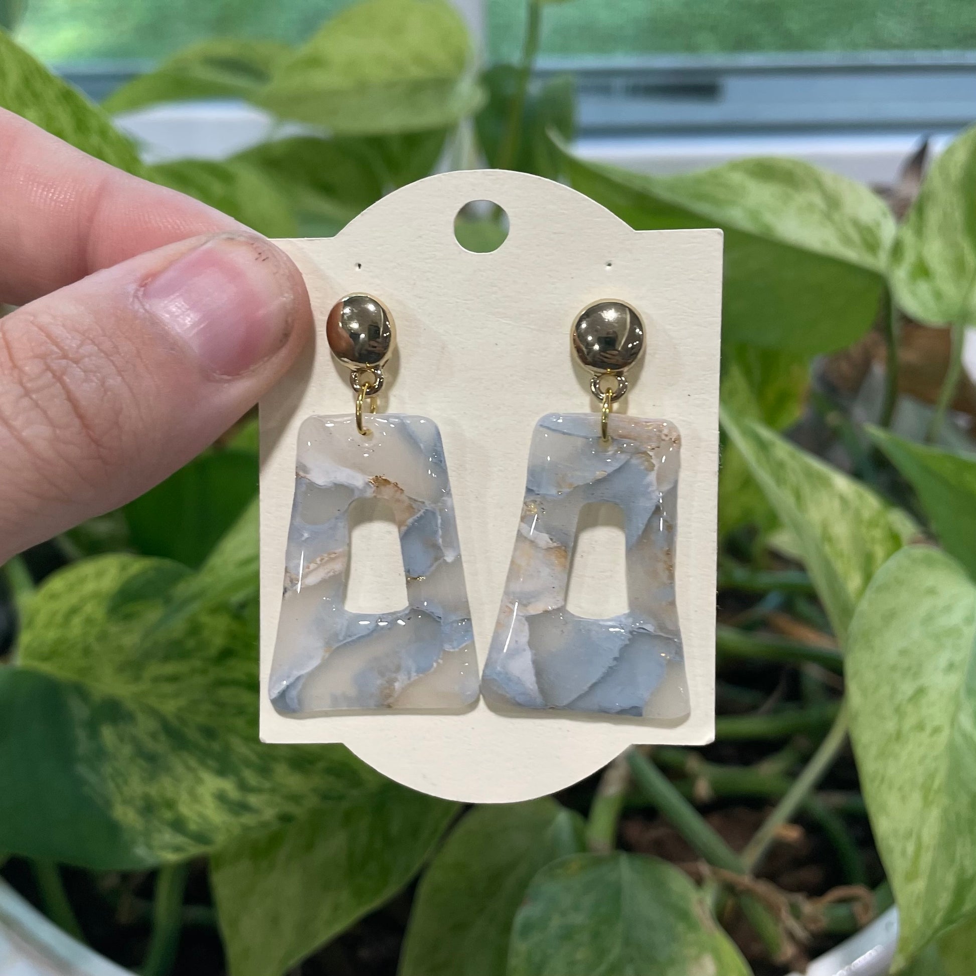 These elegant earrings feature a stunning blue and white marble design, handcrafted from lightweight clay for all-day comfort. With their modern swirl pattern and timeless color palette, they add a stylish and sophisticated touch to any look.