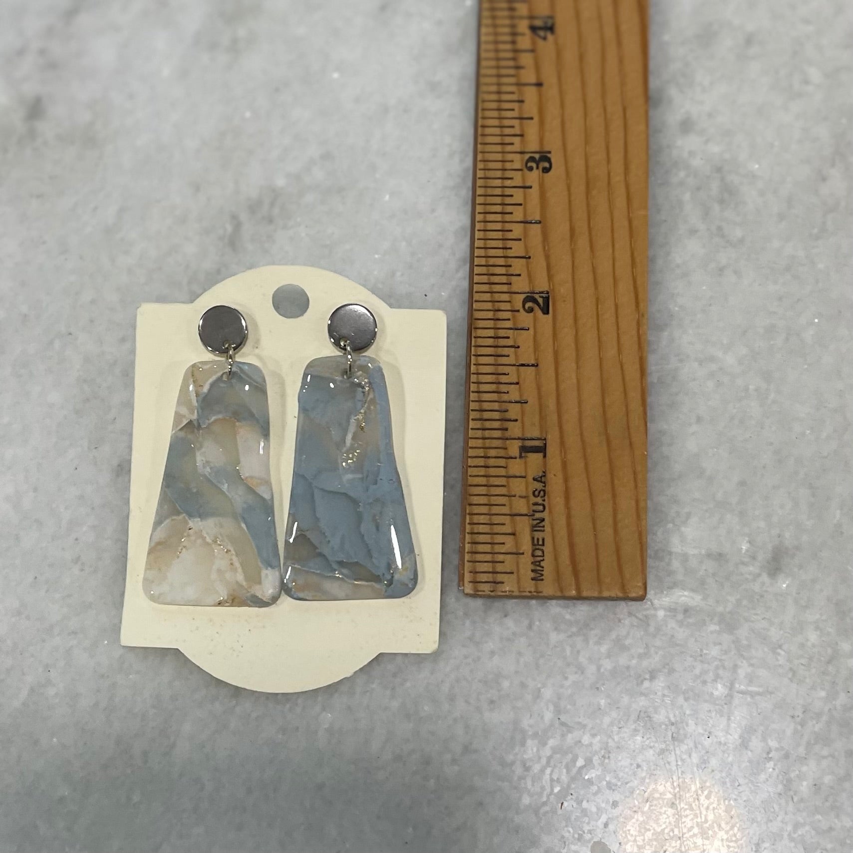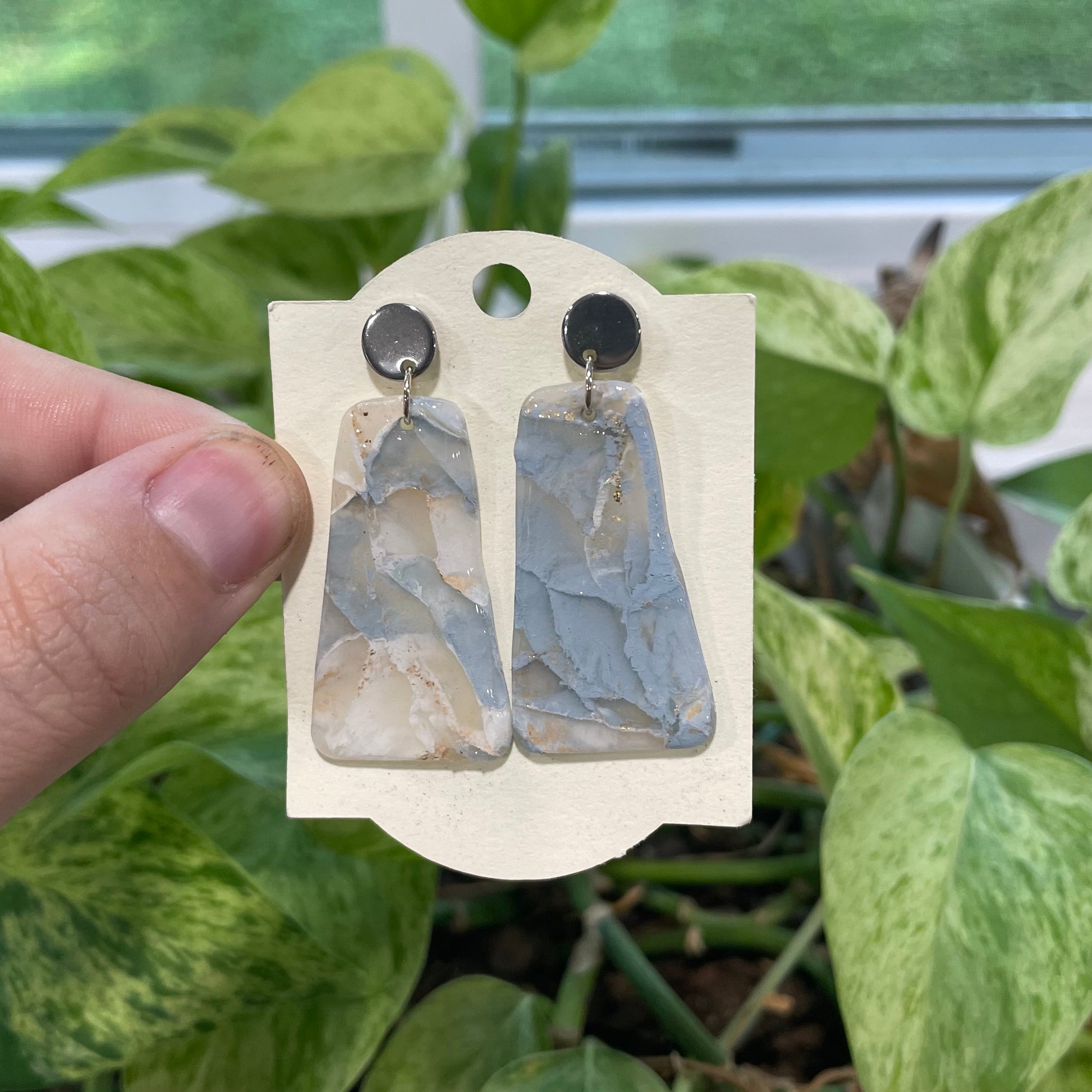 These elegant earrings feature a stunning blue and white marble design, handcrafted from lightweight clay for all-day comfort. With their modern swirl pattern and timeless color palette, they add a stylish and sophisticated touch to any look.